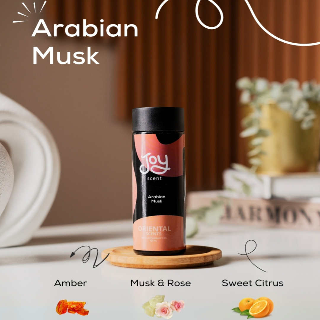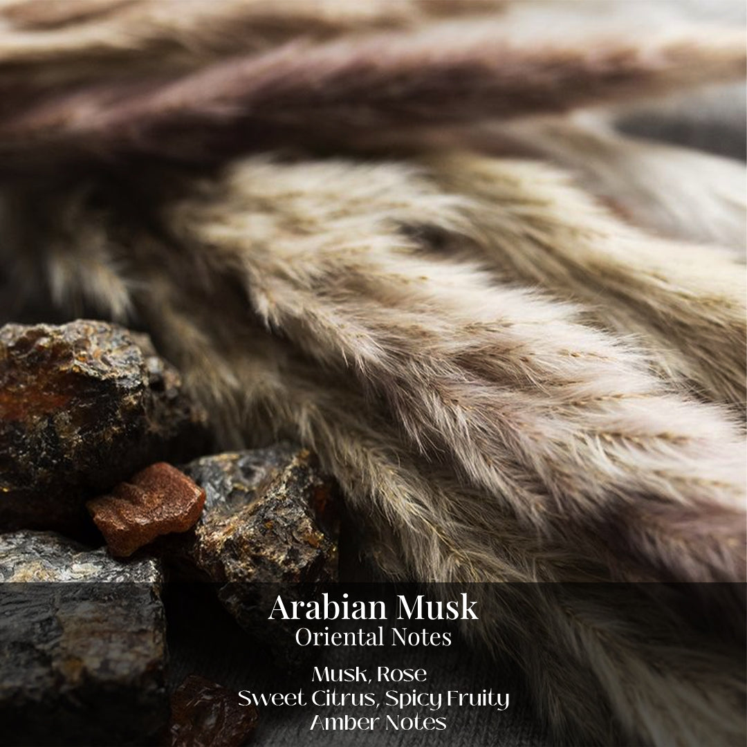 Arabian Musk is a luxurious fragrance blending rich musk, elegant rose, sweet citrus, and warm amber, creating an exotic and timeless scent.